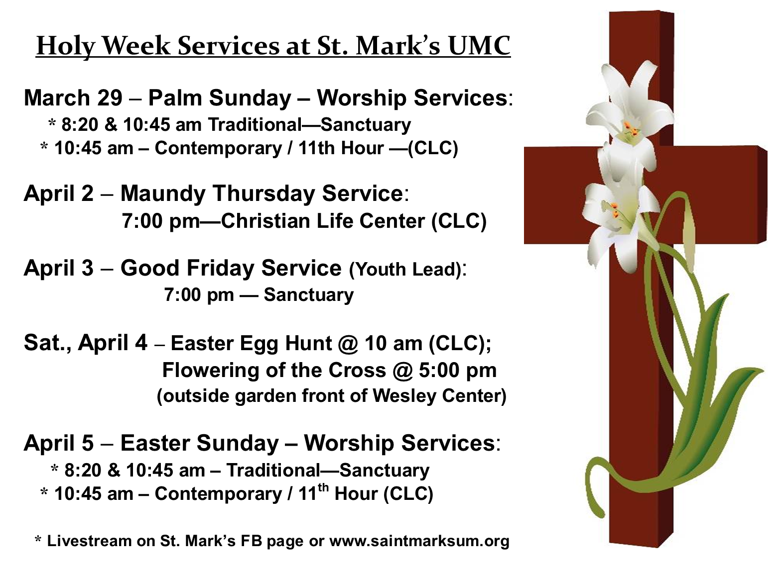 Our livestream will be available on our St. Mark’s UMC Facebook Page and our St. Mark’s UMC YouTube Live Stream.